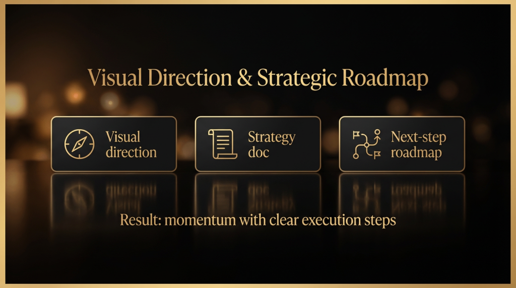 We establish visual direction and document the full brand strategy with clear next steps. This matters because strategy without execution stalls momentum. You leave with a 50+ page brand strategy, a messaging playbook, and an implementation roadmap.