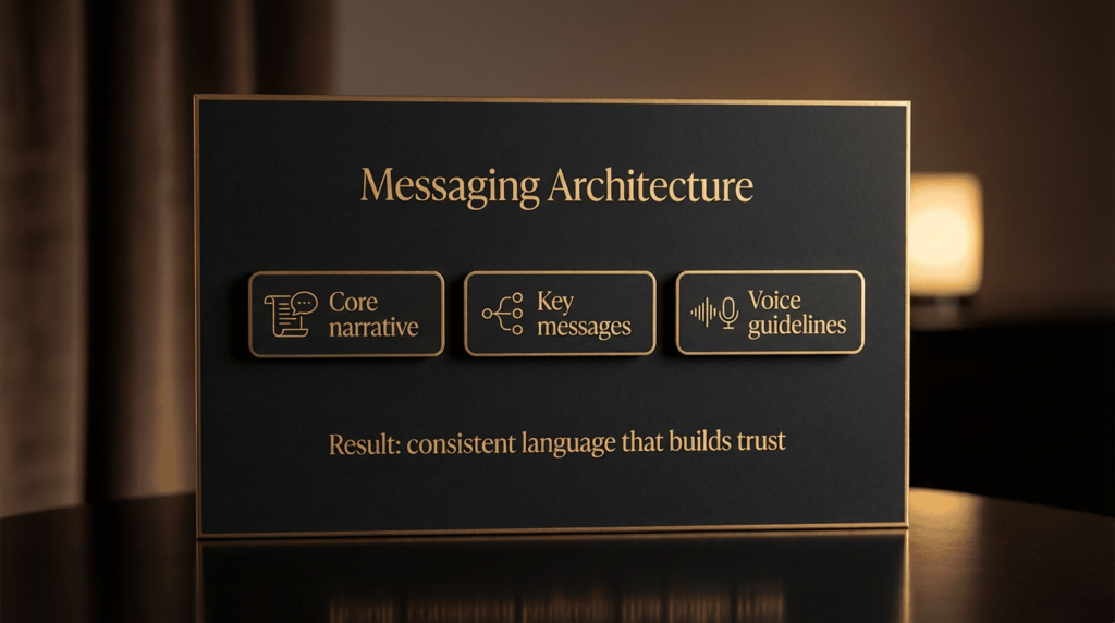 We build your core narrative, key messages, and brand voice guidelines. This matters because inconsistent messaging erodes trust. The practical result is language your team can reuse across marketing, sales, and partnerships.