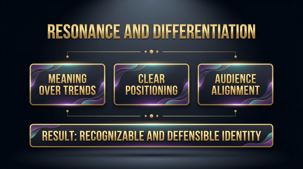 Yes—it emphasizes building around meaning rather than trends to create recognizable, defensible identity.