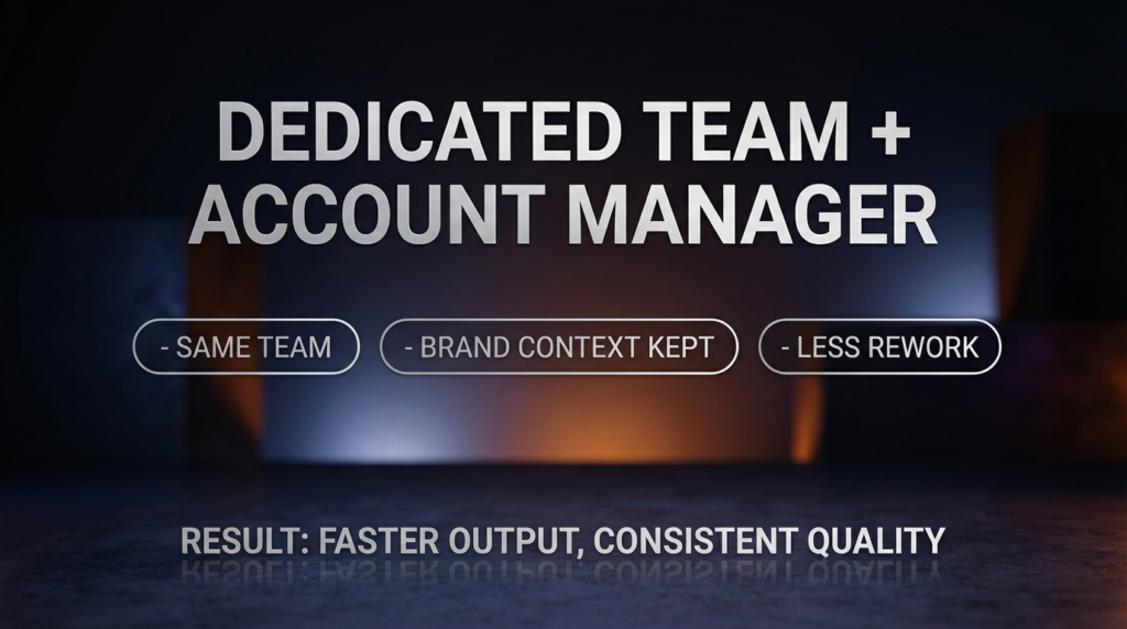 You work with the same design team and a dedicated account manager who knows your brand. This matters because context reduces mistakes and rework. The result is faster execution and more consistent output over time.
