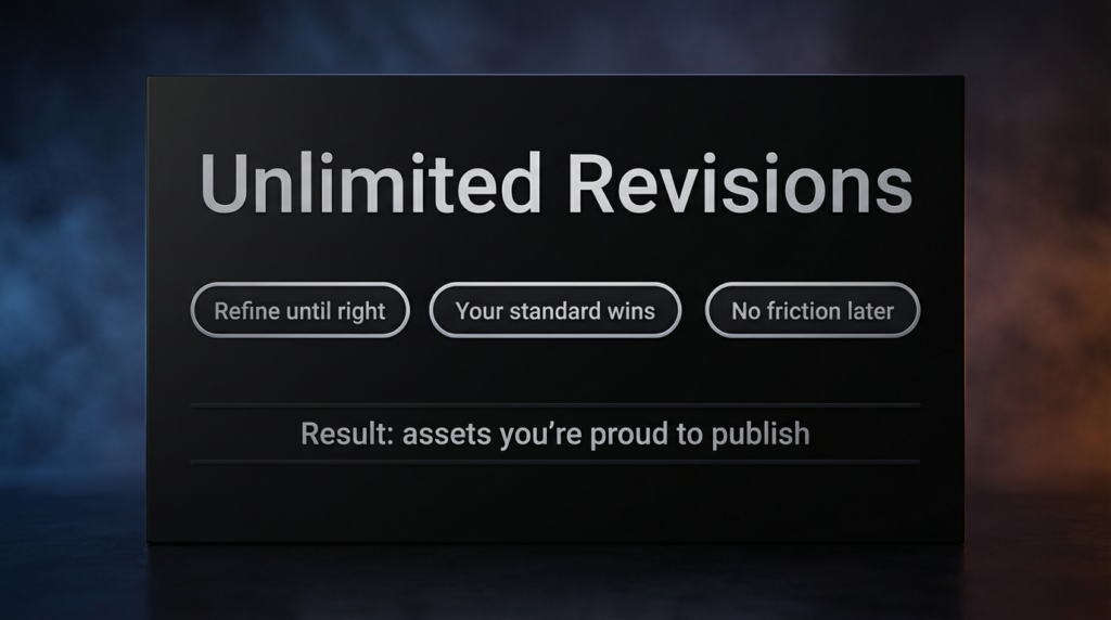 We revise until the work meets your standard, not ours. This matters because “good enough” still creates friction downstream. You get final assets you’re confident using publicly.
